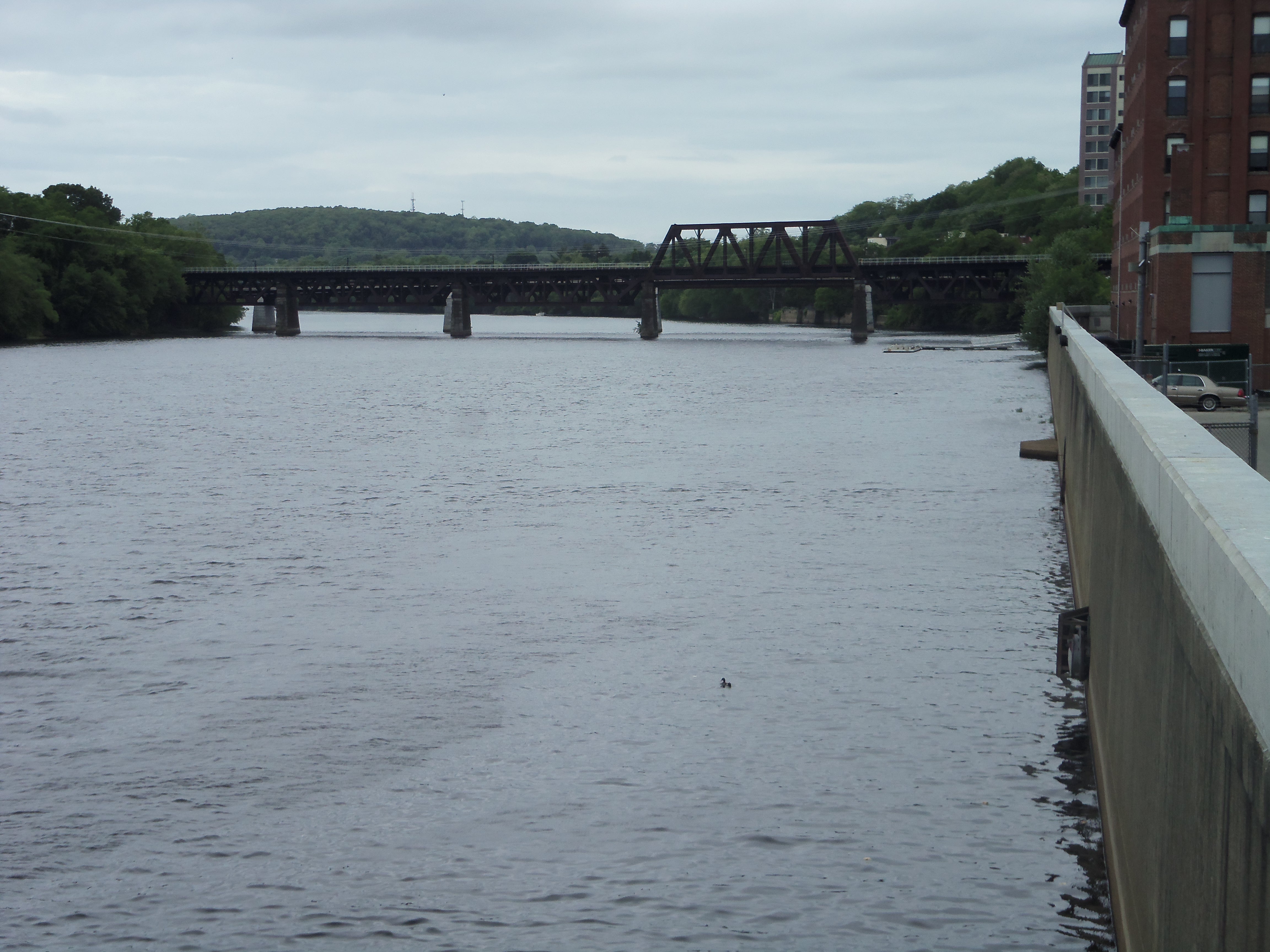 The river flows toward the Atlantic. The tides fluctuate widely here twice a day.The railroad crosses from downtown and then follows the river upstream to Lawrence. It’s a lovely ride.