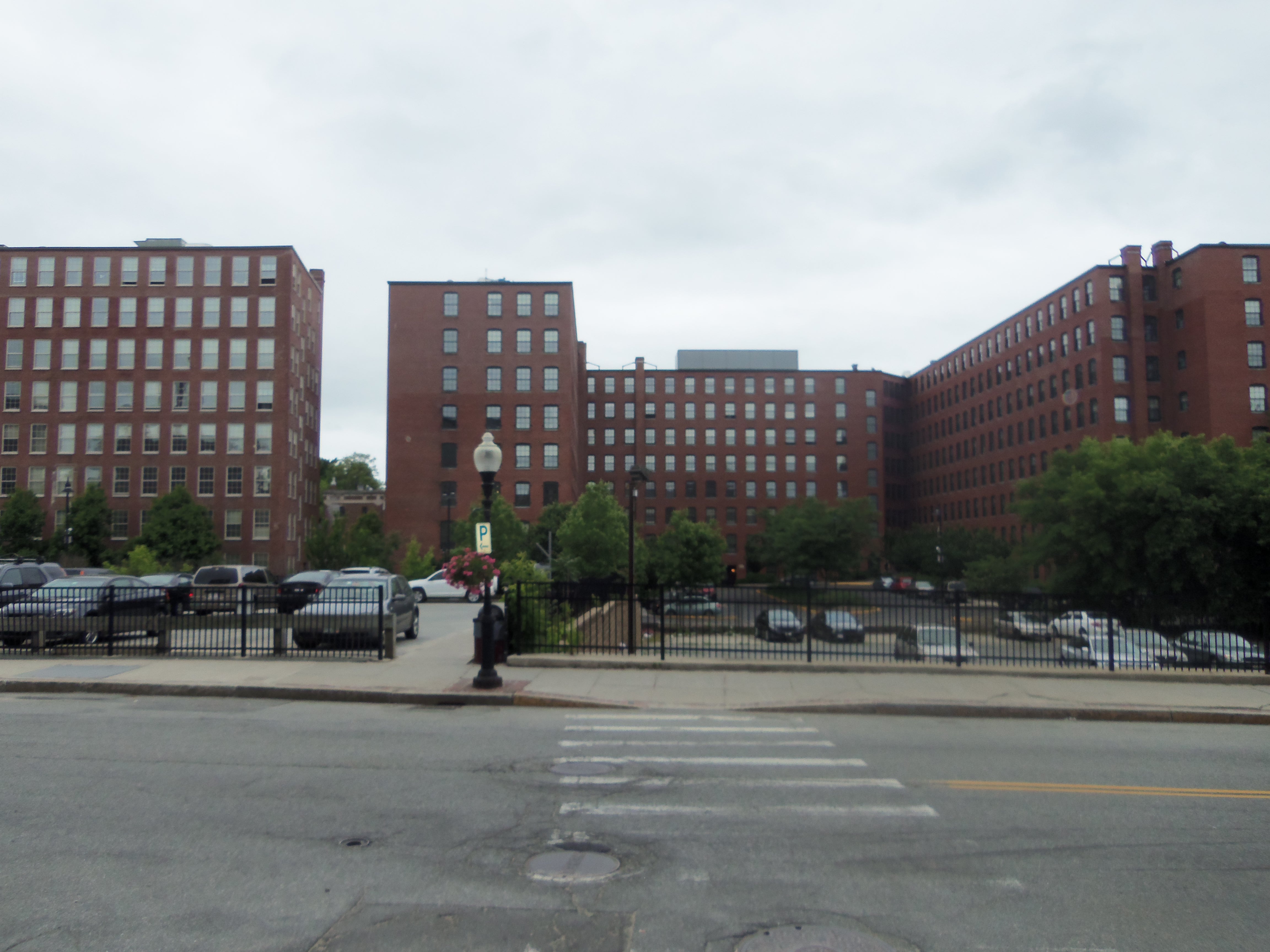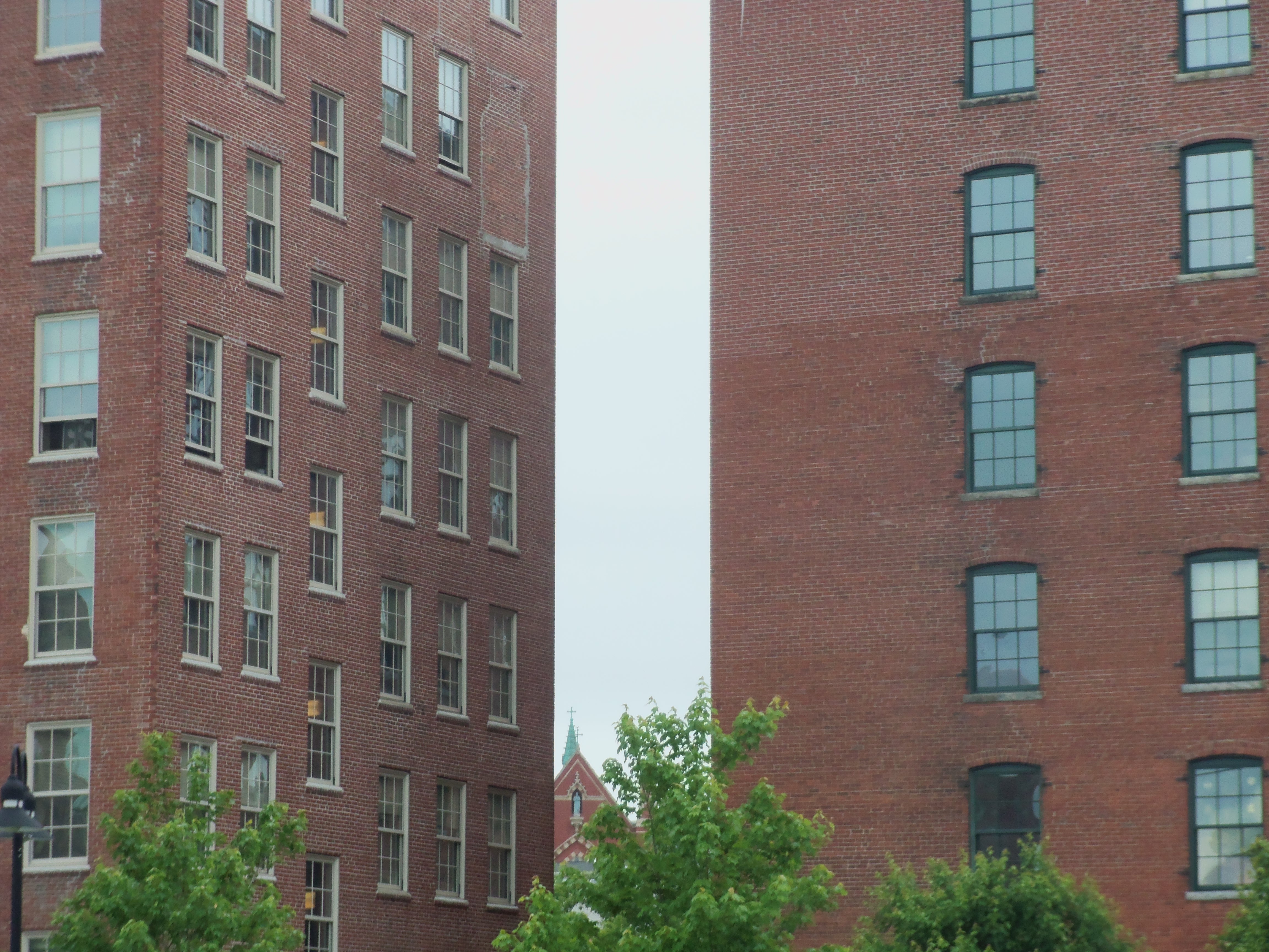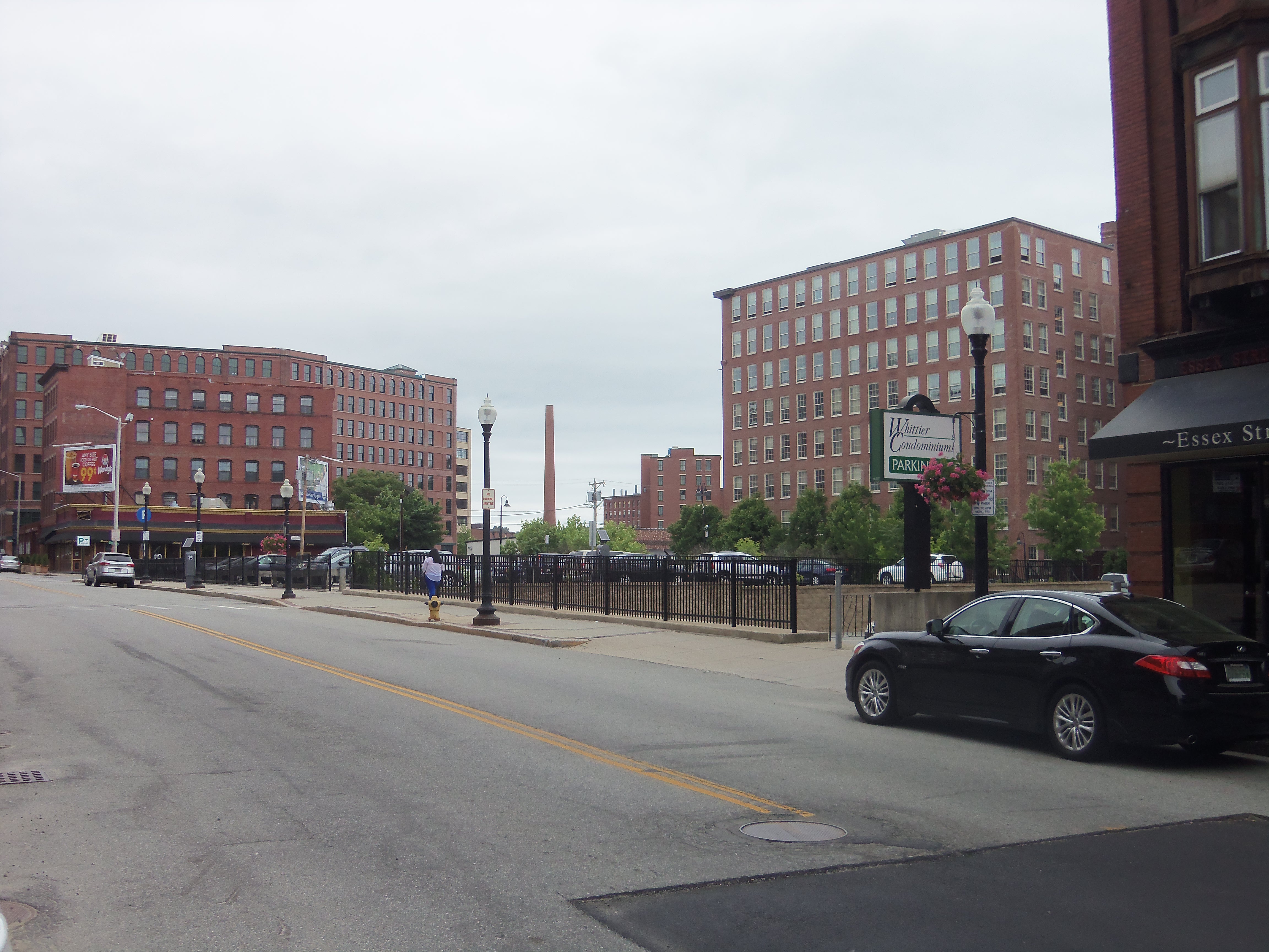 Some of Haverhill’s warren of old mills remains, including buildings converted to offices and housing.Catch the view of the distant church in the gap.Much has also been razed, often for parking lots.Here’s a bit of scale.