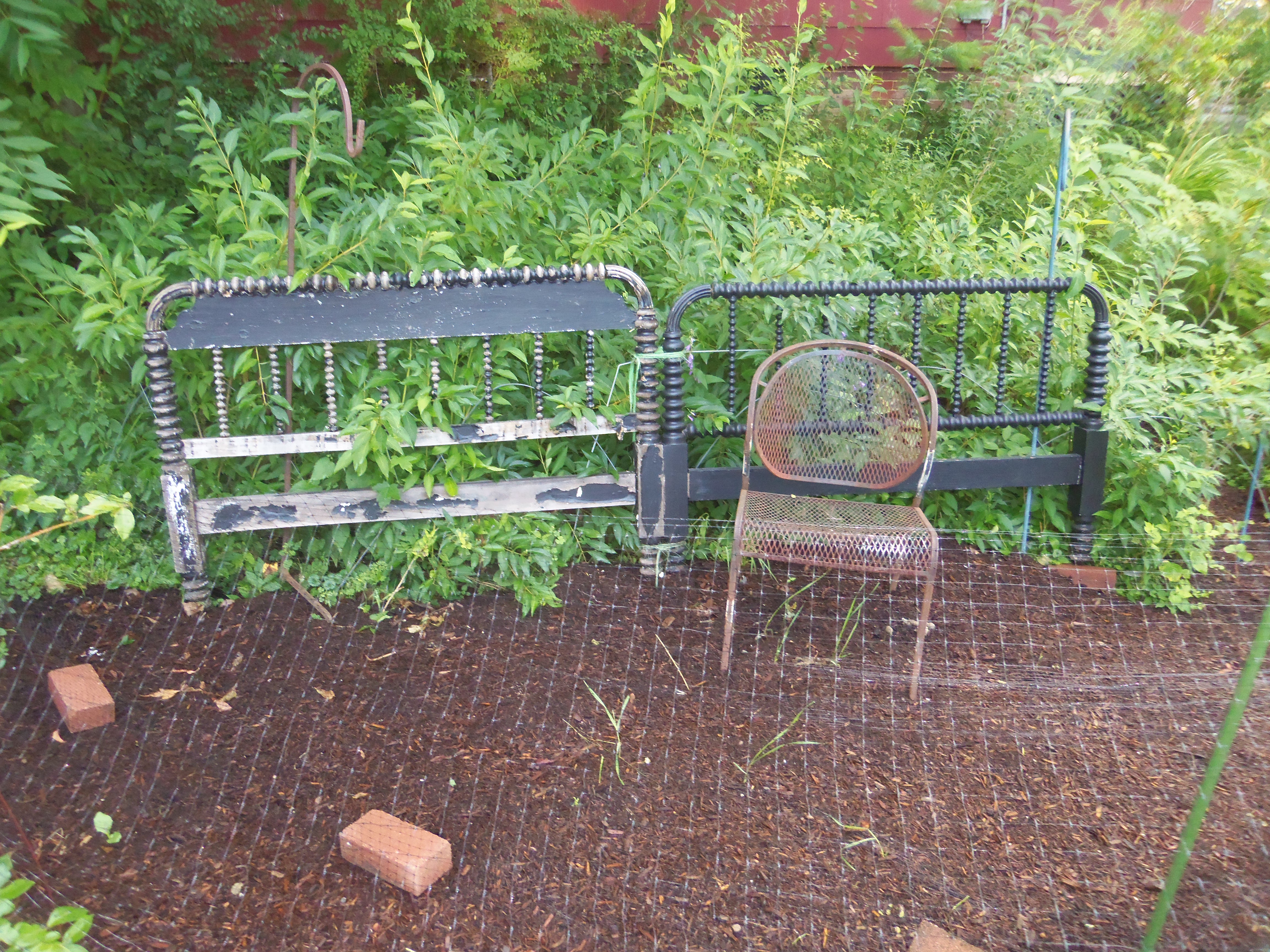 100_8850The bed stand, salvaged from a roadside, holds forsythia back so the blueberry bushes may thrive. The netting in the foreground is actually on the blueberry bushes, to keep birds and squirrels from picking all the berries, rather than on the ground, where the bricks anchor the netting.