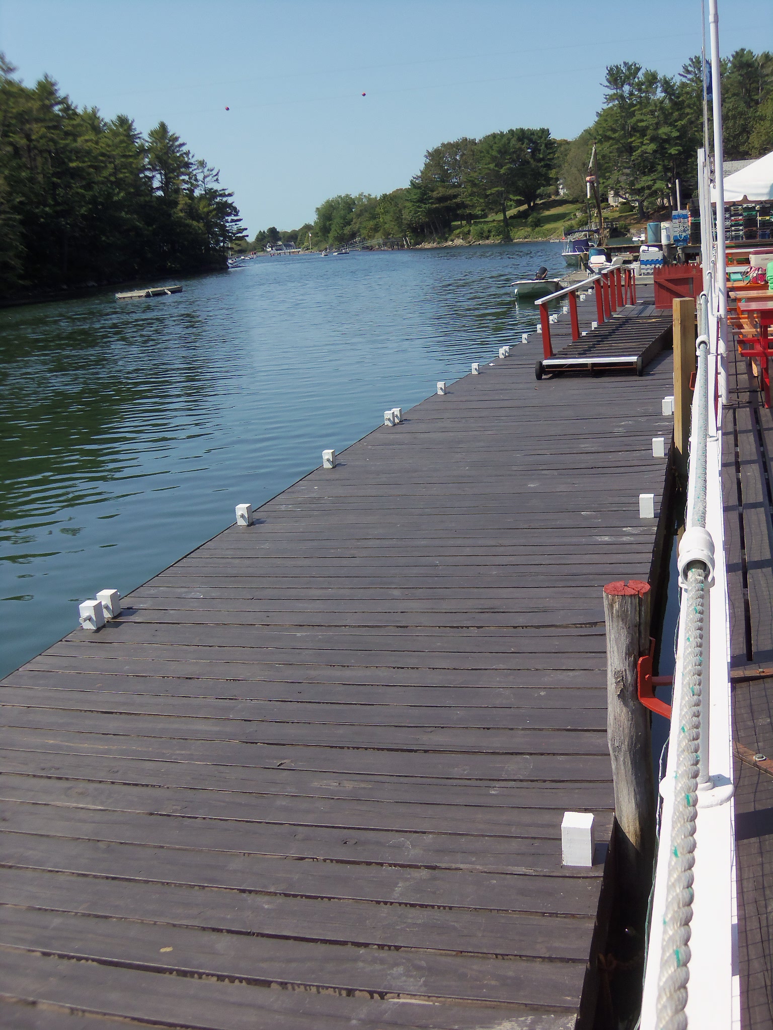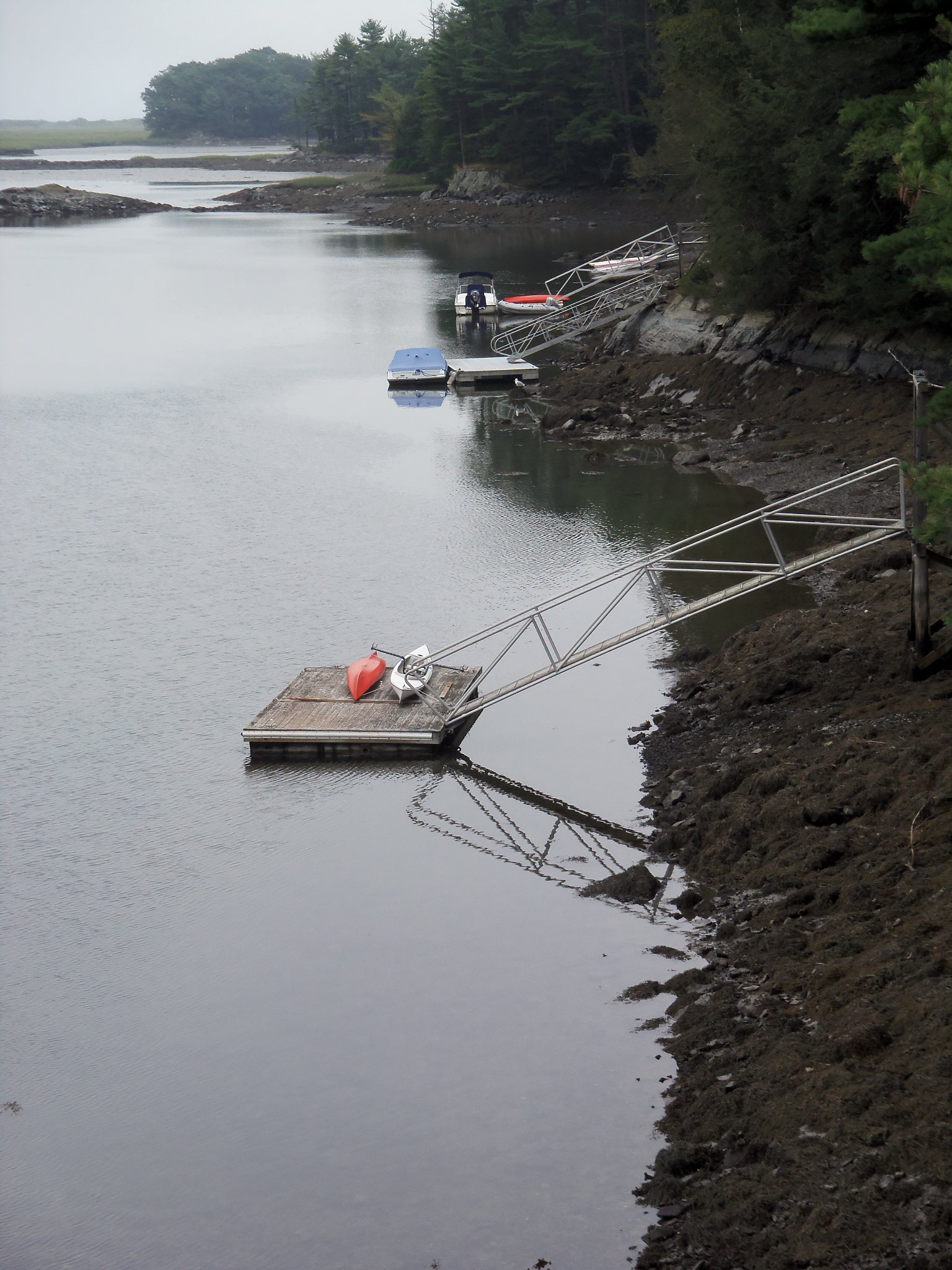 A popular lobster restaurant is perched at the bottom of a cliff. Some of its patrons tie up at this dock. Most park in a crowded roadside lot above. Their oysters on the half shell, by the way, are unbeatable.