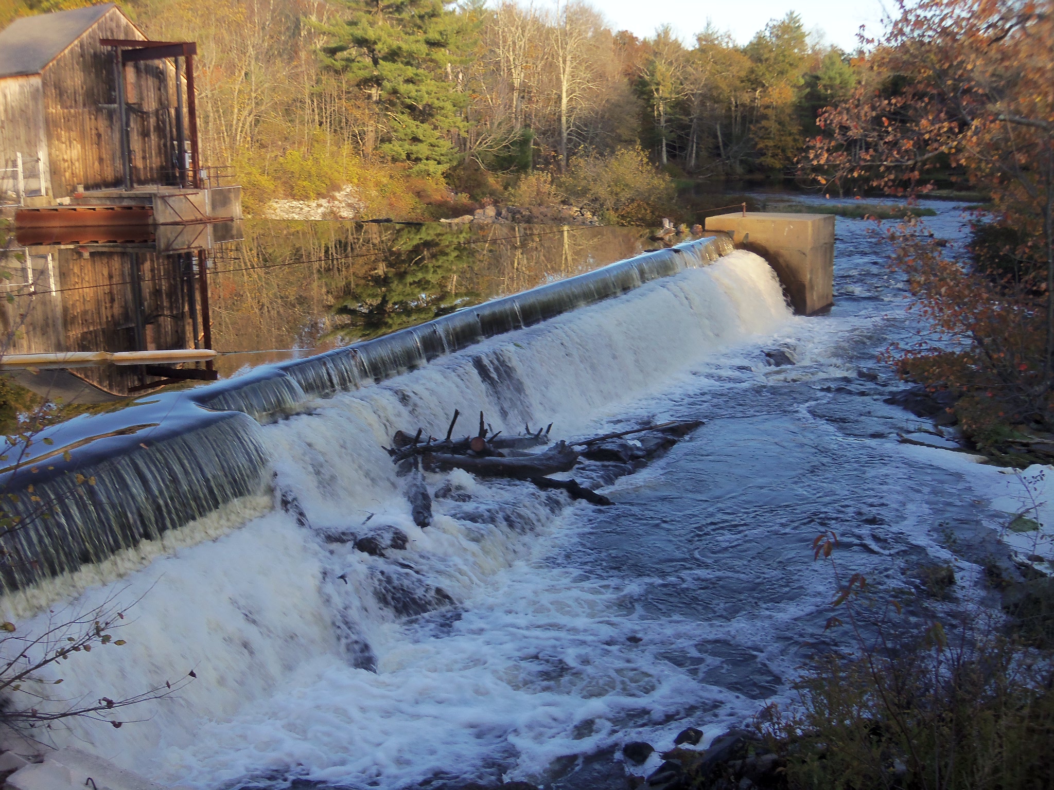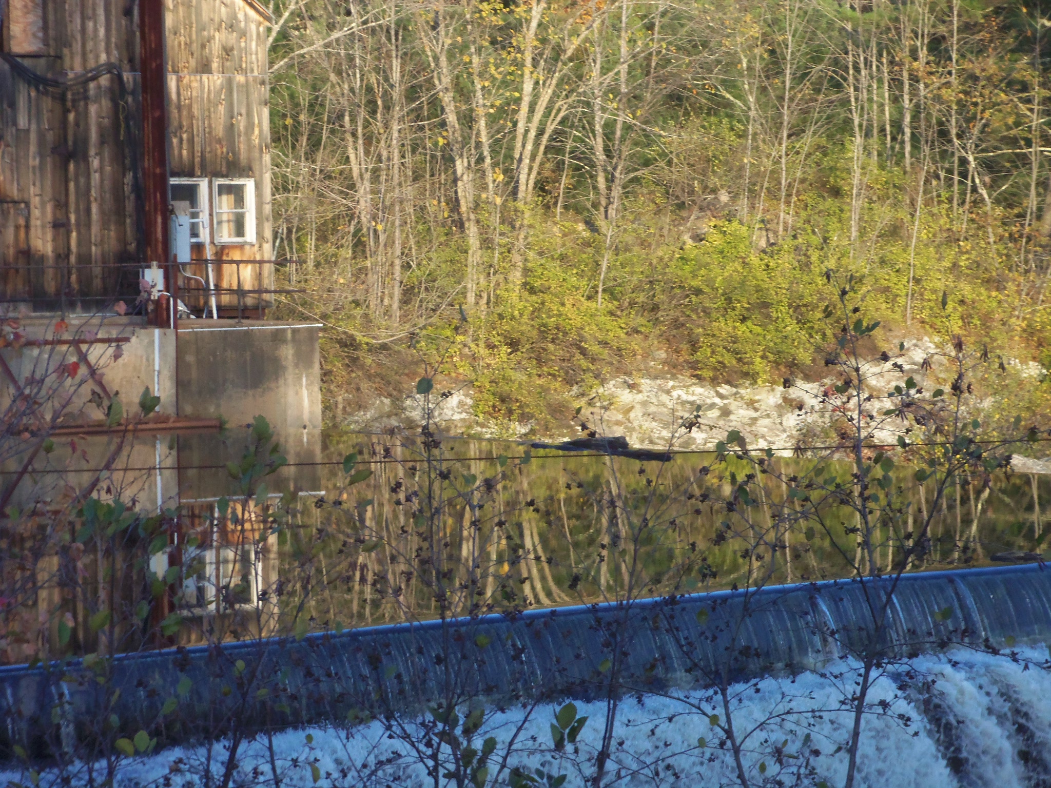 Why let power go to waste? A small hydroelectric station captures a share of the Cocheco River. The Watson Dam itself is a V-shaped design stretched across the stream. I imagine it runs in front of a waterfall.