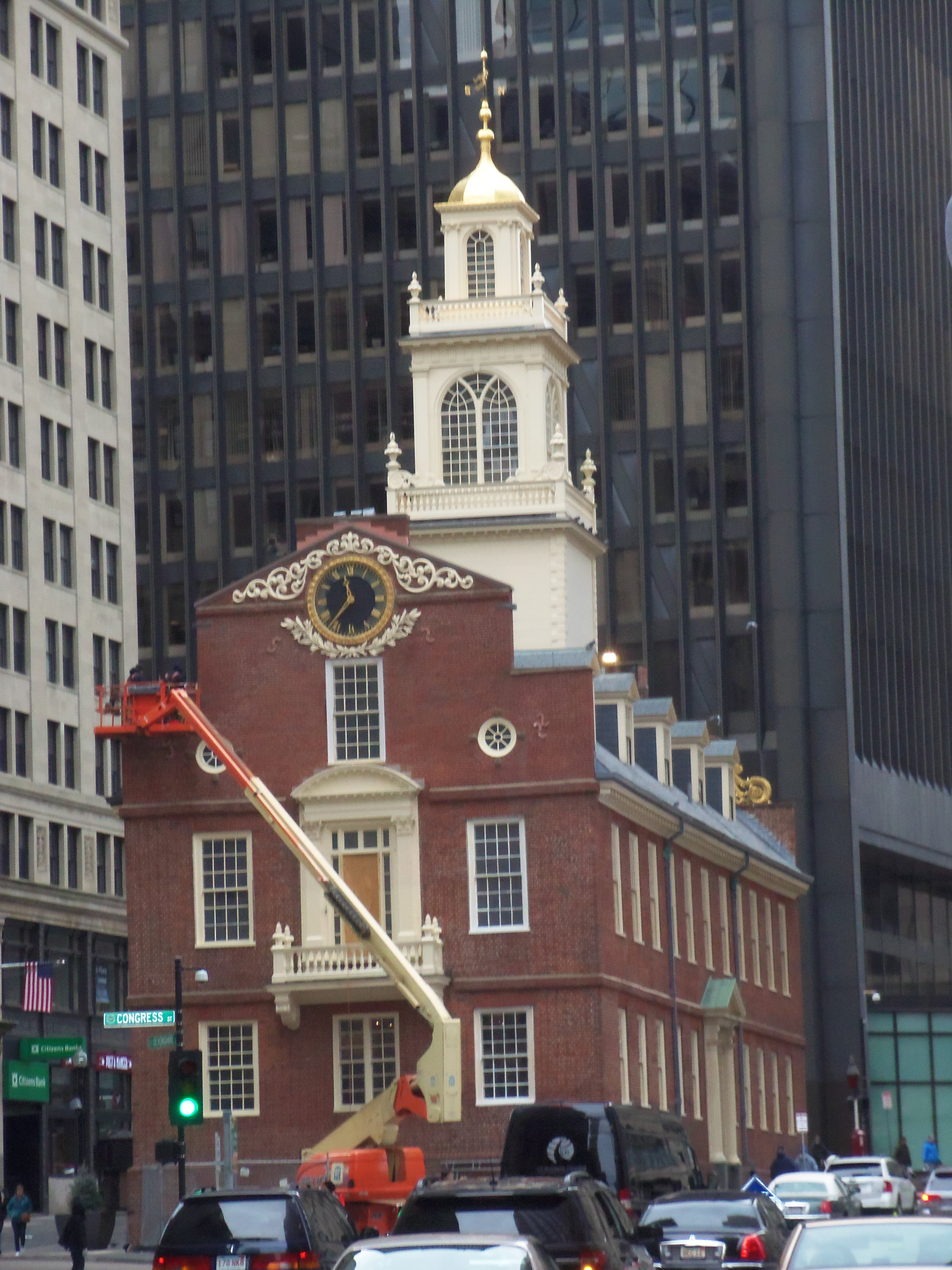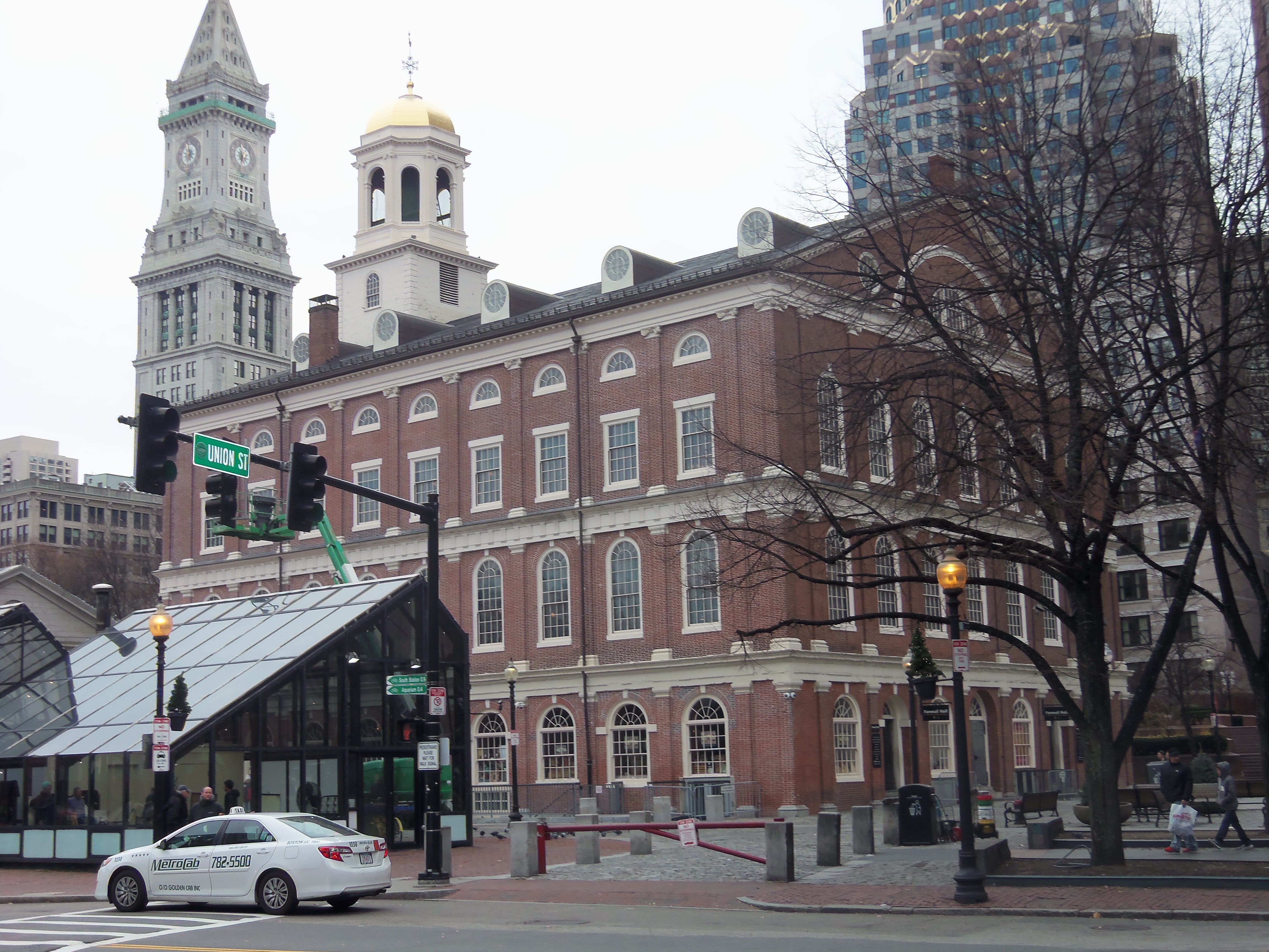 Faneuil Hall, Quincy Market, and the Old State House stand close together in downtown Boston. It doesn’t take much to imagine historic figures appearing here.