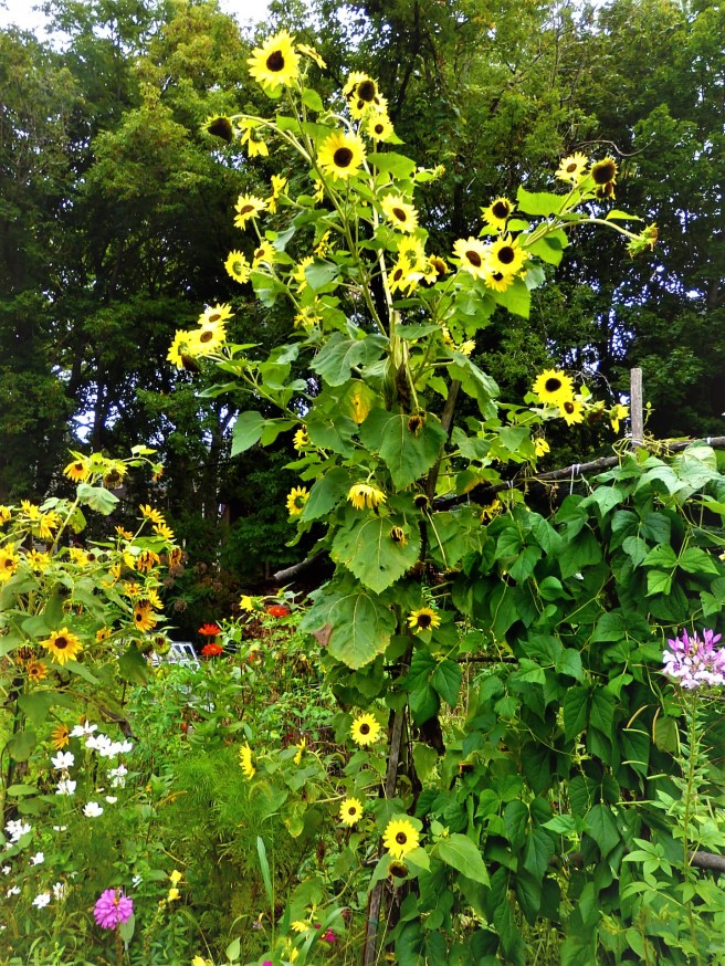 It’s been years since we last planted sunflowers, but we can count on them in our garden. They self-seed from previous years. The birds and squirrels find the kernels to be irresistibly tasty. We’re curious to see how our honeybees react when the scene gets to this point in a few weeks.