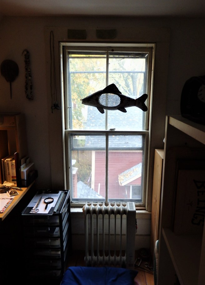 My wife found this unusual copper fish at a yard sale and left it on our barn stoop over the summer. On a whim, I brought it inside and hung it in my studio window on the third floor. Nothing fancy, just a quirky reminder of our proximity to the sea. Whaddya think?