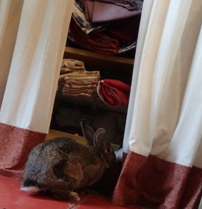 We let our bunnies run free on the first floor during the day. They love to explore, as Pepper is here, but they also love just hanging out in their favorite spots.