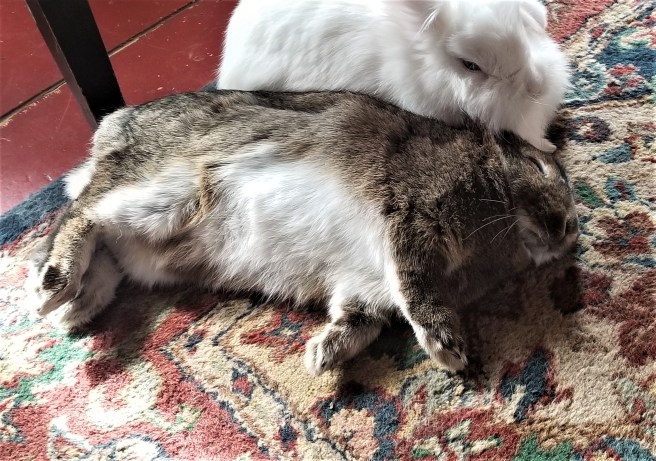 We’re still learning not to panic at scenes like this, where one of our rabbits looks like rigor mortis has set in. It’s even scarier when one’s running about, stops, and then flops over into a deadly pose like Pepper’s here. That’s when I look closely at her side to see if she’s breathing. Grab a camera, though, and the subject pops right up like nothing’s ever happened just as you’re ready to click the shot. My wife finally caught this instance, and I’m envious.