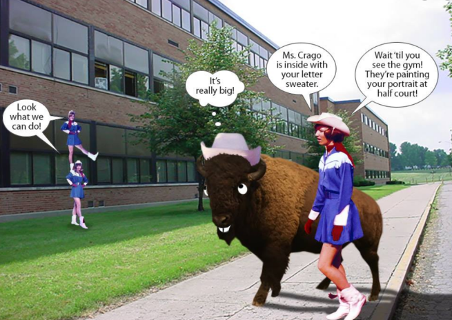 Missing is the wonder of how we ever came to have a buffalo as a mascot in the first place or how our drill marching team came to be widely known as cowgirls. We were in an industrial city so far from the Wild West. How weird!