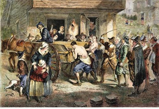 He’s also the mastermind behind the invitation to the Natives to participate in a mock war game and festivities in 1676. After the 20 armed Natives fire their weapons, they are surrounded and arrested, along with 350 or more, mostly women and children. Seven or eight of the leaders are sent to Boston and executed. The rest are sold into slavery in the Barbados or West Indies.