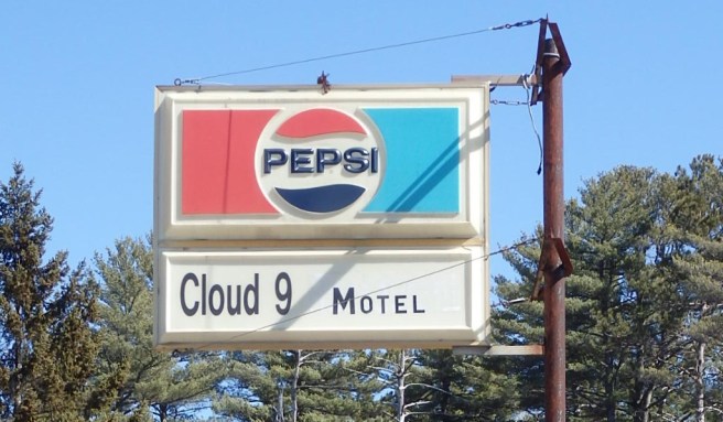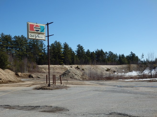 The Cloud 9 Motel sign stands out along State Route 9. Initially, the name seemed to reflect some misplaced hip ’60s jargon. What we encounter is far from a plush, consummate destination. Eventually, I connected the “9” to the highway. Ha-ha.As you can see, there’s no motel, just a sand pit, on Maine Route 9 – the Airline Highway – four miles west of Wesley.A postcard shows the place in its prime in the ’70s. It had eight heated motel units and sold gasoline, groceries, beer to take out, and light lunches in what it touted as the heart of some of the finest hunting and fishing in Maine. Many of the sportsmen returned annually, but times change. The buildings came down in 2015.