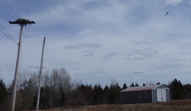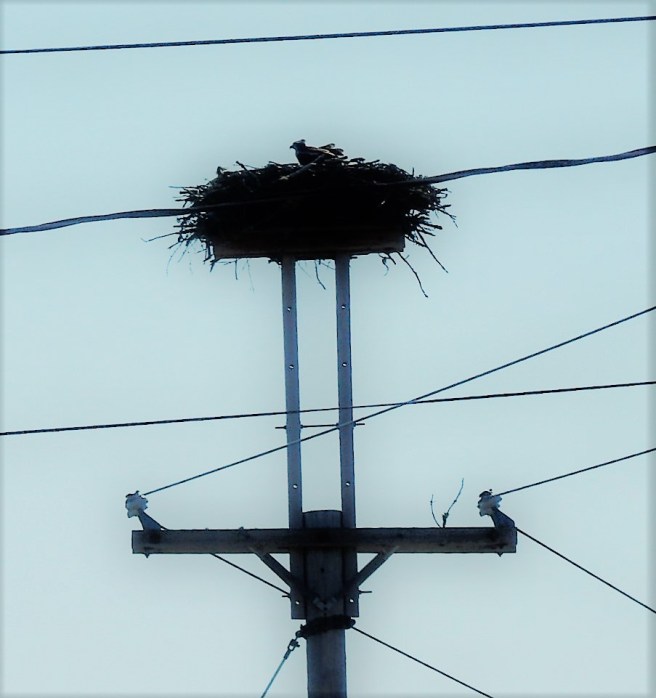 Mama’s head keeps a vigilant watch. For some reason, osprey often build their big nests atop power poles. This one is in Cutler.Once alarmed, she’ll take flight, raise a racket, and threaten to attack. So beware. As I learned in East Machias.Here’s an active nest in Princeton, atop a post in a human family’s yard, actually.In Pembroke, there’s this impressive nest atop a piling at a landing. Almost looks like the structure was built for these majestic birds.