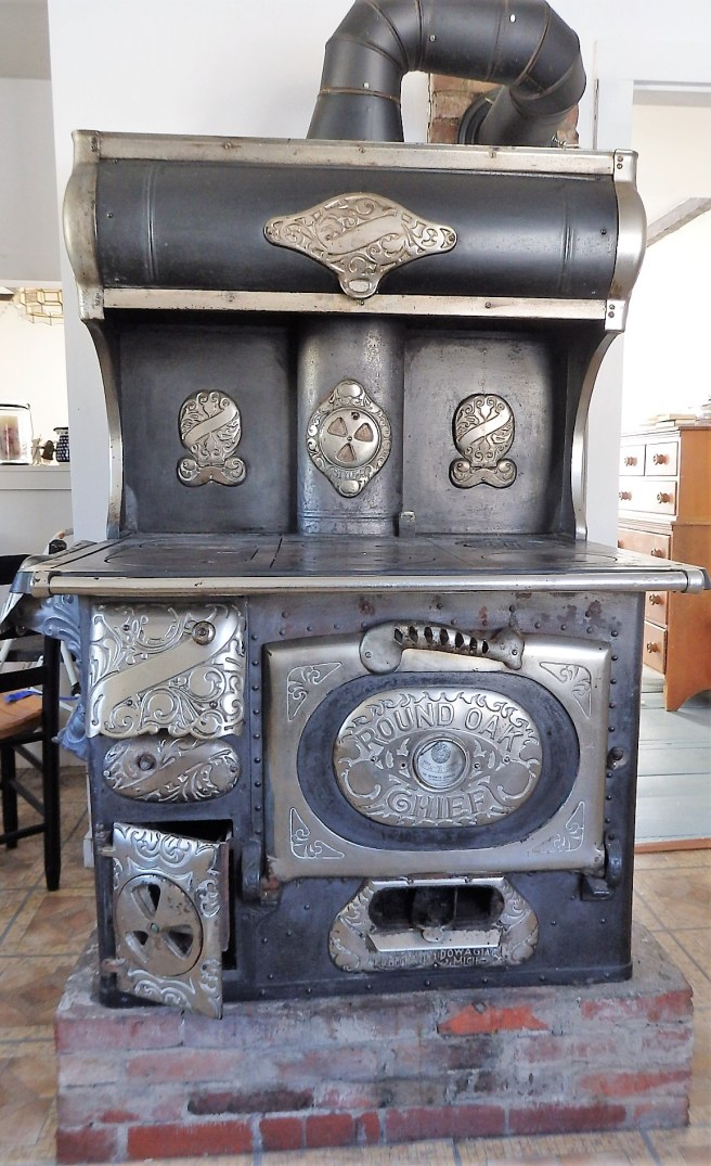 I’ve used wood cooking stoves, back in the ashram, but I wasn’t so sure about this one. I didn’t like the way the stovepipe ran somewhat downhill – smoke rises, after all – or the way it vented into the same chimney the furnace uses, something that’s against building code today.