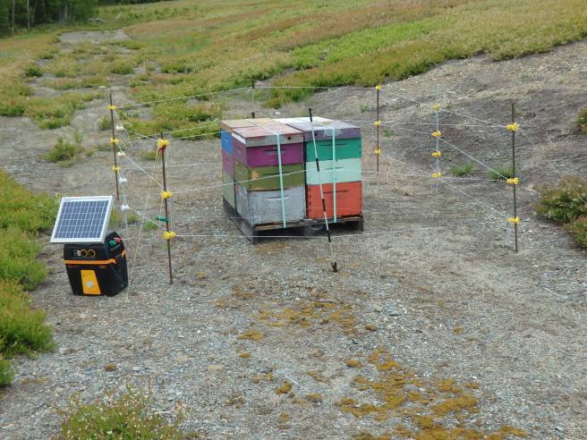 For a few weeks each spring, clusters of commercial honeybee hives are placed by the hundreds throughout the barrens. The electrical fencing is intended to keep bears out.