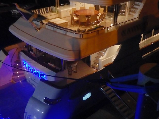 Charters for $130,000 a week plus expenses and fees.It’s 130 feet long, holds ten guests in five room, takes a crew of seven, and cruises at 12 knots. The waitstaff was pretty impressive, even from a distance.Includes his and hers bathrooms in the master suite, a jacuzzi, and a gym.