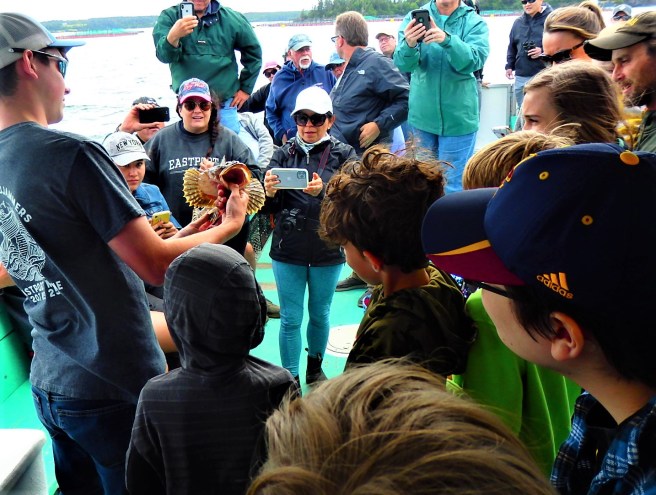 More likely is walking down to Butch and Jana Harris’ Eastport Windjammers and setting forth in one of their refitted lobster boats. The vessels are smaller than the usual whale-watch models but put you much closer to the water. The route, from downtown Eastport out between Campobello and Deer islands in New Brunswick, doesn’t need to go into the open waters of the Bay of Fundy. On at least one of boats, you can even stand beside the captain – usually, but not always, Butch – and, on occasion, each of the kids on board gets to briefly take a turn steering at the wheel.