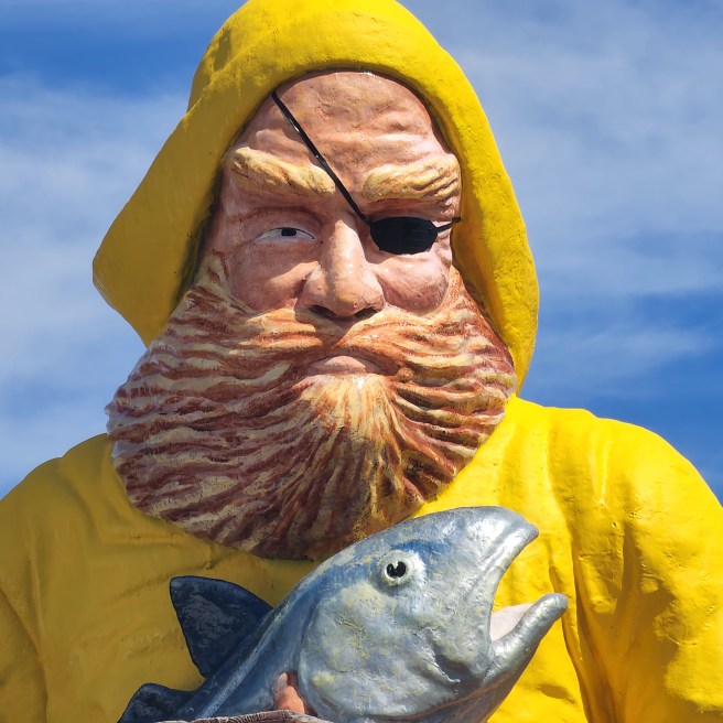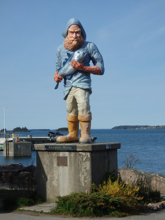 I thought the guy was kidding when he pulled up in town and confided that he was going to repaint Eastport’s iconic waterfront fisherman statue, changing the blue coat to a yellow slicker. I was sworn to secrecy at the time, but the next day, there he was, in full light, doing the deed.