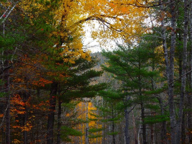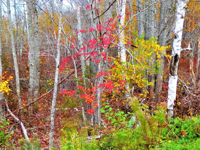 What I’m now encountering is Coastal Downeast Maine, with its own variations. The forest is largely evergreen, which of course stays green. But it does provide a solid background for the deciduous trees as they change.