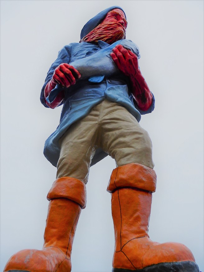 Fortunately, the fisherman got a new coat this summer, a bright yellow one. Seeing the old one now comes as a shock.