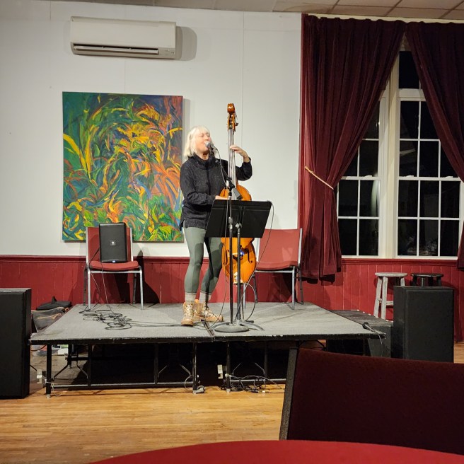 Here Joan is at our monthly open mic event, both singing and playing bass. She’s also a key player in MICE, the Moose Island contradance band, and a welcome member of varied combos. She even starred at our Mardi Gras night at the senior center while definitely lowering the median age.