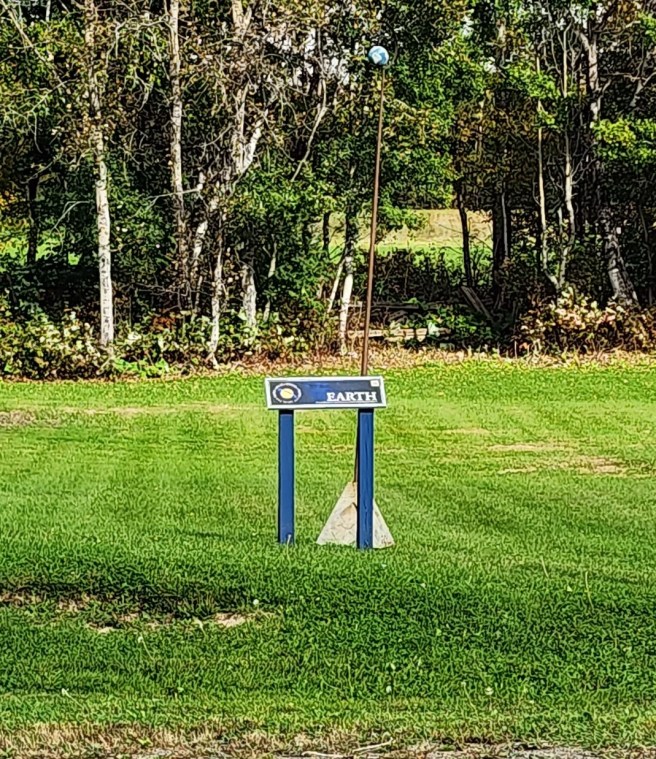 Exactly a mile from the college, for good reason. The scale for the solar system model is one mile on U.S. 1, befitting the astronomical unit (AU), which is the distance from the earth to the sun. Everything else was then put into relation to that.