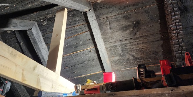A few weeks before starting on the renovation, our contractor stopped by with his mentor slash consultant for a closer look. More concerning, from their point of view, was the lack of a ridge beam. The rafters from each side were simply mitered together. In addition, they were further apart than current coding would permit.
