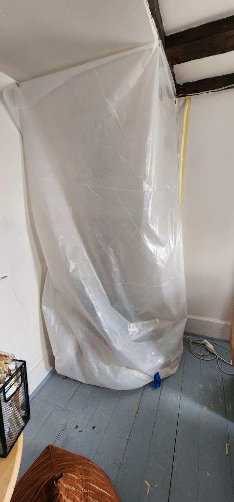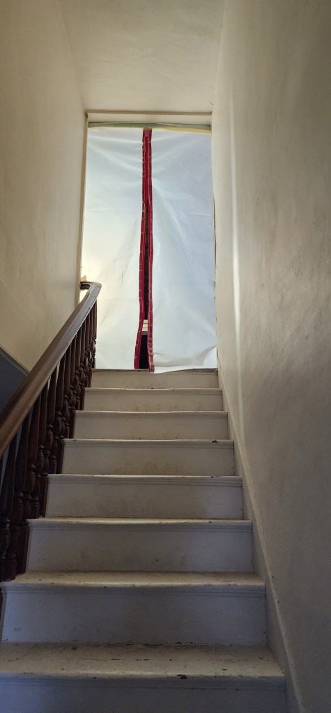 The zipper doorway to the second floor was the first step. And when working on the main floor, Adam erected clear-plastic envelopes he could work within. Made me think of the so-called “state rooms” on the historic schooner I sailed on last summer, where every inch was treasured. Adam’s power vac became a familiar sound.
