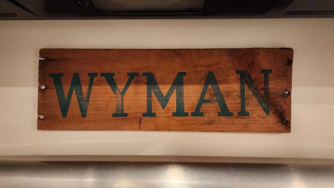This attractive wooden plaque above the stove caught my attention. Good use of a serif typeface in green ink.