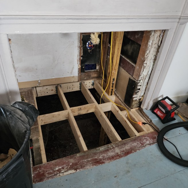 We had passed on an offer to rebuild the brickwork, no matter how charming a working fireplace would have been. The chimney would have limited our remodeling options on the second floor, or so I argued, and without it, we do have a 2½-by-5-foot space to develop into a closet or something on the main floor. Patching the floor itself would be a huge improvement, as well, rather than having a light covering that couldn’t bear weight.