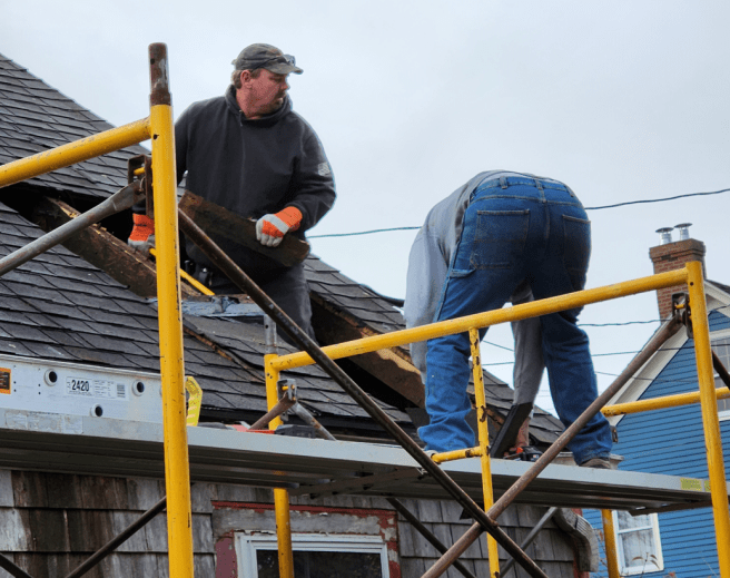 After a week or more of finetuning the ridgepole and columns, Adam was ready for more drama. It was time for the old roof and rafters to go.