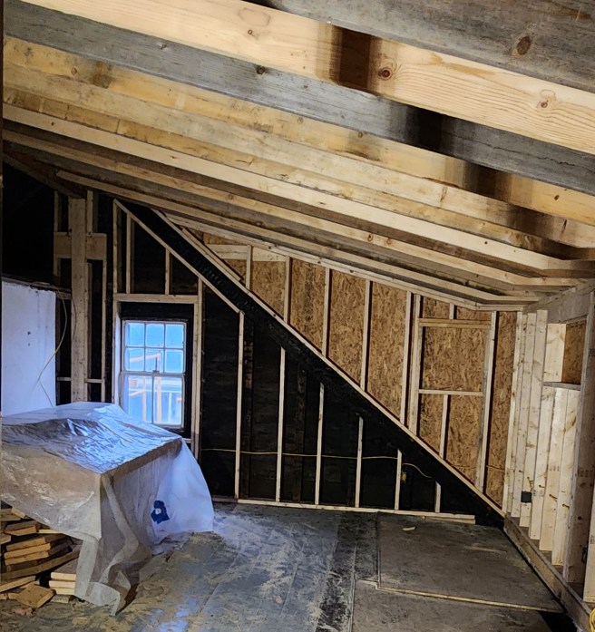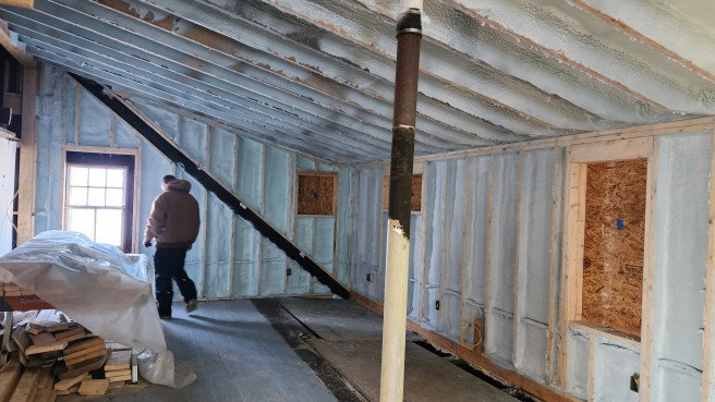 Those were steps that had to be taken before the spray-foam insulation crew showed up – which they did, two days after promised and leaving us with a nonrefundable Airbnb reservation. On top of that, we were required to be out of the house for 24 hours after they finished. Back to the Airbnb reservation. The crew’s deadline here was also contingent on a bigger job they were doing downtown – the two brothers live an hour-and-a-half from Eastport. We were second in line.