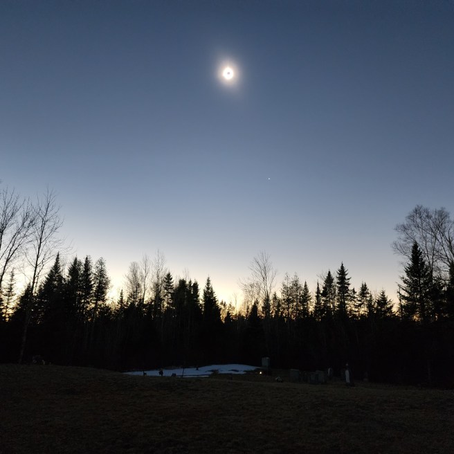 Against all odds for this time of the year in Maine, the long awaited full solar-eclipse day delivered ideal weather. Amazingly, especially for April, after a week of gray, rain, and snow, the sky stretched cloudless, the air was crisp, and temperatures edged into the 50s. It felt too good to be true. If I had been a betting man, this was a wager thing I would have lost.