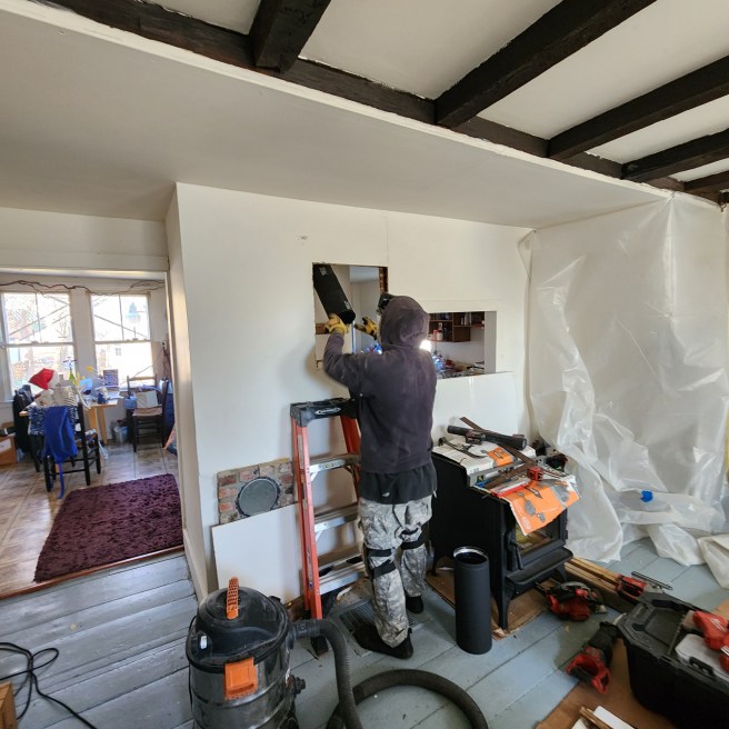 Tim confirmed that our best smoke-venting option was to run an insulated metal chimney pipe straight up next to the existing brick one. At this point, with our upstairs about to be torn apart and the rafters exposed, we wouldn’t be disrupting anything there. Our ultimate placement of the stove itself would require moving a water heater and a cold-air vent in the floor. Not that big of an issue, now that we had a contractor. Glory be!