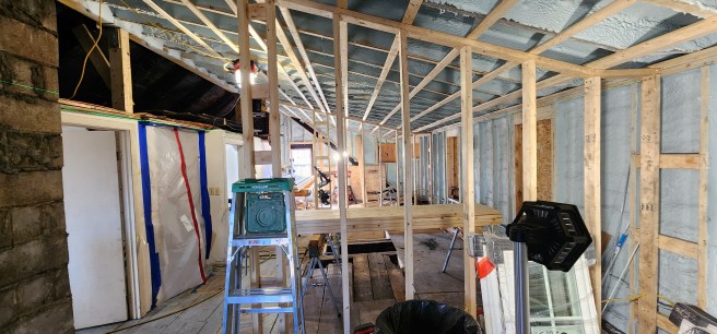 All along, we kept hearing mysterious pounding and shaking overhead, the whine of power saws and the thumping of an air compressor, along with falling timber or worse. I learned not to anticipate taking a nap during what other’s consider normal working hours.