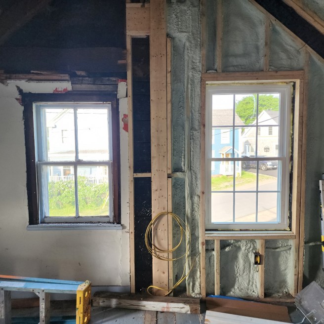 The new window, right, replaced a smaller one like the two-over-two at the left in the gable of our upstairs. The smaller one will soon be upgraded as well, and a closet will be inserted into the space between them to divide the bedrooms. The new double-hung sash windows match the ones downstairs in size. The amount of additional light and the enhanced views already amaze us.