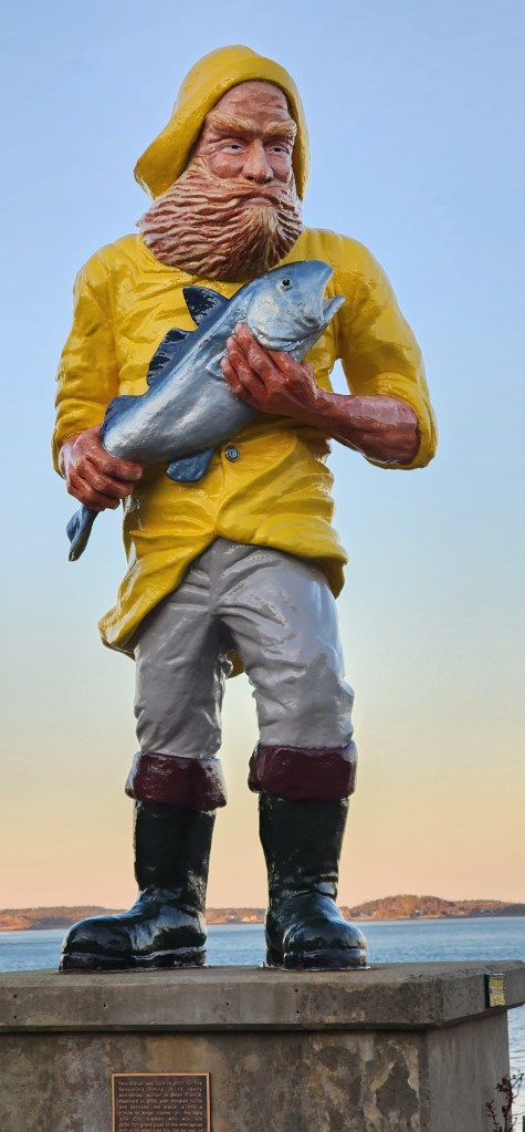 The statue, a leftover from a television series set in the town, really does look much better in the yellow slicker than the blue-gray one before. But he still doesn’t look like any of the real characters I’ve encountered living here.