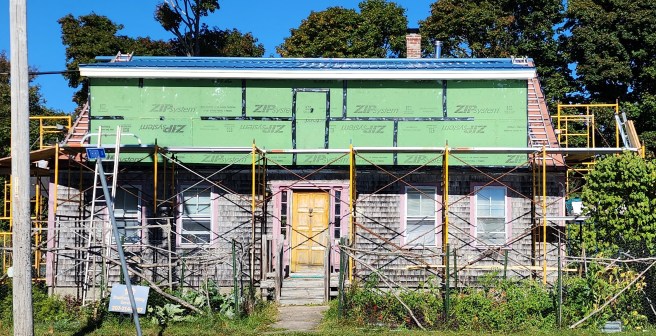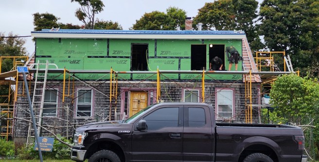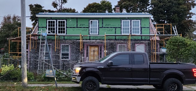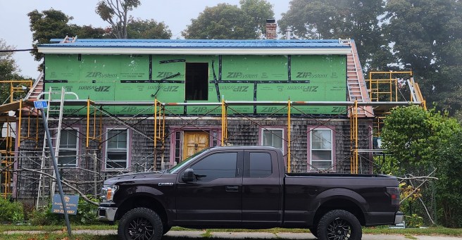 The latest example is on the front upstairs, now that the roof is raised, the top’s covered in standing-seam metal roofing, and the windows are finally obvious.