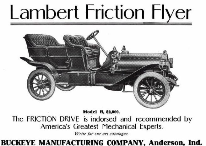 - Buckeye Manufacturing, which built the cars, had moved by 1905 to Anderson, Indiana. The Lambert Automobile Company was one of its subsidiaries. Touting its Lambert Friction-Drive Automobiles and Trucks, the Buckeye factory mass-produced Lambert’s cars, gasoline engines, and auto components as well as fire engines, railroad inspection vehicles, and steel-hoof tractors before closing in 1917. At its height, the company had more than a thousand employees.