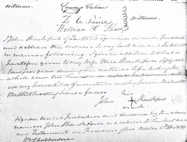 A harder to read codicil of October 5, 1839, raises the amount of the annuity to “my wife Eliza Shackford” to $200 during her natural life and “all my furniture and my pew in Baptist meetinghouse forever.”
