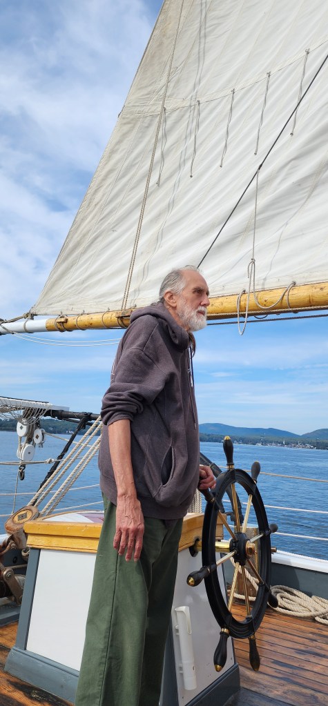 On cruises aboard the historic schooner Louis R. French, passengers get opportunities to pitch in with the work. We help raise the anchor and the sails in the morning and we wash our own dishes. Sometimes, when the water’s calm, we even get a spell at the wheel, where you do get a feel for the interaction of the wind and water as well as the delay in the boat’s response to a change in the course. Here I am at the end of last summer.
