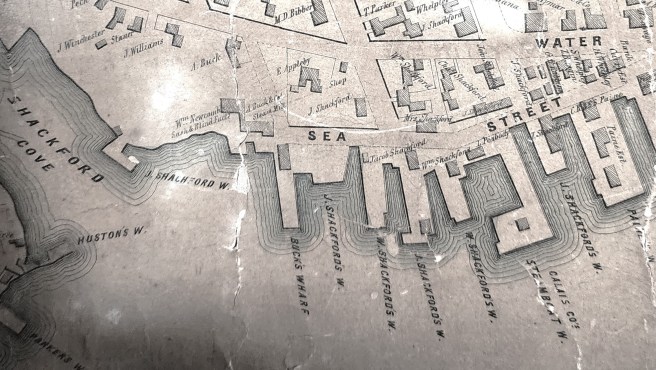 The 1855 Eastport map, produced shortly after Samuel had relocated to Chicago, illustrates how much the family had flourished. At least 13 buildings are labeled Shackford — most of them along Water and Sea Street just below our house. Many of the latter were likely warehouses and offices related to the six Shackford wharves and piers flanking the Calais Co.’s Steamboat Wharf, at the time owned by John junior.