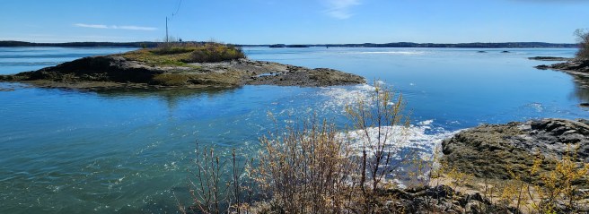 Our rocky shoreline includes sporadic pocket beaches, too. This one faces tiny Dog Island, shown below.