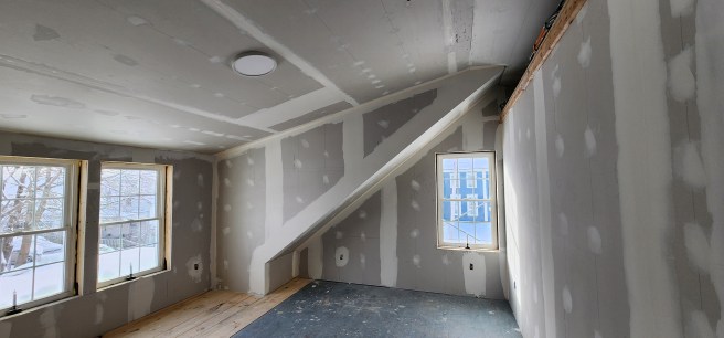 In the two front bedrooms, the width of the two side roofline panels was halved when we saw how much the original, aligned to the old dormers, really confined the rooms. The purpose of the panels was to keep a sense of the original profile of the house as seen from the street. What we wound up with does the job.