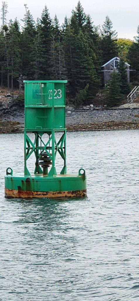This “green can” at Heron Neck on Vinahaven Island has a gong mechanism rising from its base. Rocking in the waves makes it sound, as we observed on a cruise aboard the historic schooner Louis R. French.