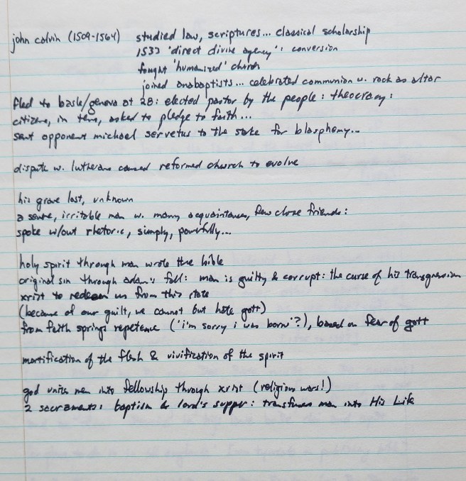 And then details on Jack Hus (1373-1415), Wycliffe, and Calvin.