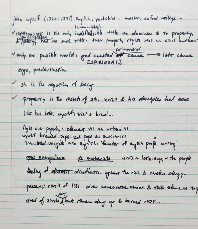 Wyclif: sin is the negation of being. Property is the result of sin (Jesus and the apostles had none) … he is the founder of English prose writing.