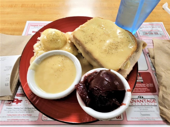 Open-face hot turkey sandwich at a great diner-style eatery in Mexico, Maine.