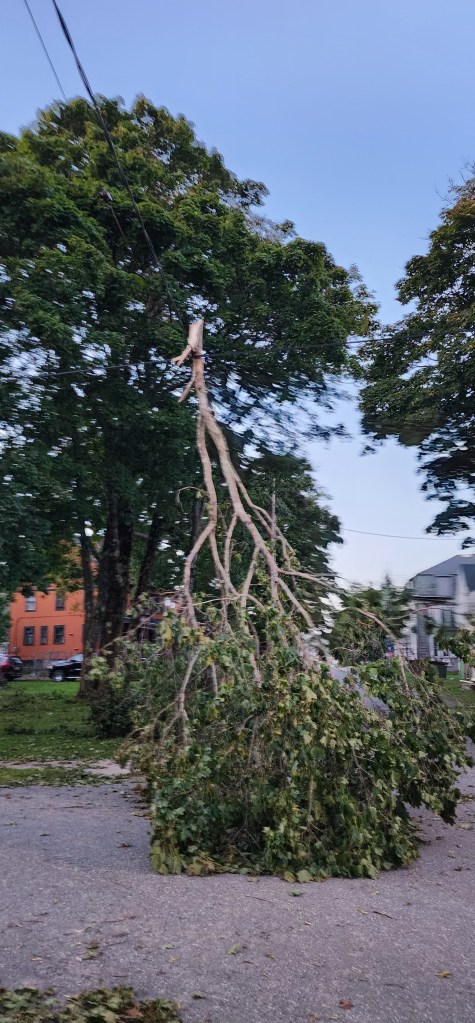 Nothing in the freezer had thawed. We had four to six inches of water in the cellar, but that would be going down rather than rising, as long as the power held. I stepped outside and saw that the roofing, including the patch, had held. The top of the tree was still in place, though there were some big limbs in the said neighbor’s yard.