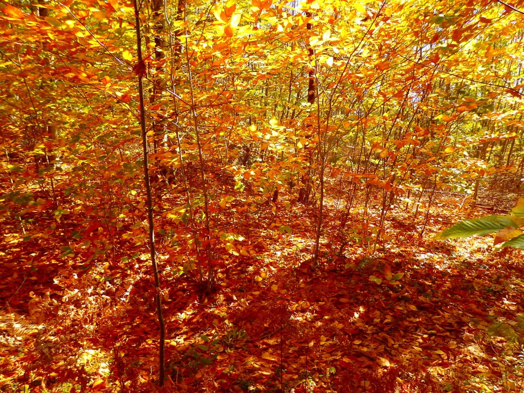 This past week, though, has changed my opinion. In driving about, I’ve come across large swaths in full color – not the usual mixed green and bare mixed in – and properly illuminated, even in an early morning mist and fog, not that my camera would capture that. It soon becomes almost too much, too rich, for one’s eyes to handle.