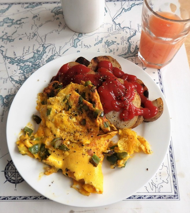 A cheese, green pepper, and mushroom omelet using eggs from our next-door neighbor’s hens is served with home fries made of potatoes I purchased in Aroostook County. Notice there’s no need for ham or bacon. I do love grapefruit juice, by the way. Brunch like this remains a favorite Saturday tradition for me.