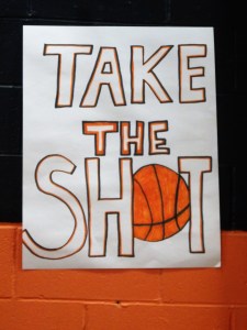 That said, being back in high school, even it’s only a building, stirs up its own mixed feelings. I did resist an urge to deface a sign, TAKE THE SHOT, by altering one letter. I would be a horrible student if I had to do high school again. For instance, those PA announcements that interrupt the calm of my stroll really could prompt comedy. They’re unintelligible, far as I can tell, but they do have sound effects. BLARROOM! BLARROOM! Seriously. And you wonder that those kids aren’t learning anything? I think back in antiquity we relied mostly on bells, but I do vaguely recall that “come to the office” demand from a speaker box above the escape door.