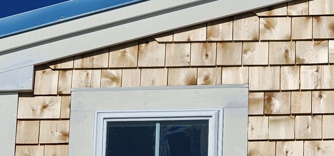 We love the little detail of the upturned notch on these cedar shake shingles. It matches the earlier ones that will remain on the other half of the exterior.